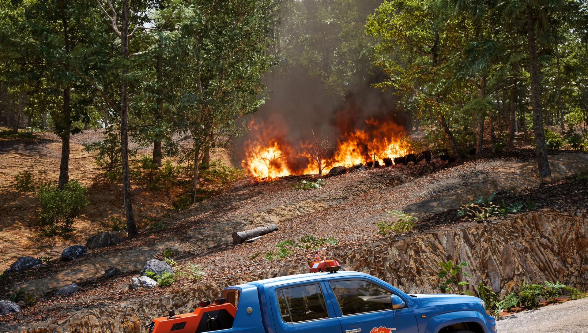 Scenario-based product showcase presenting firefighting systems operating in forest fire environments.